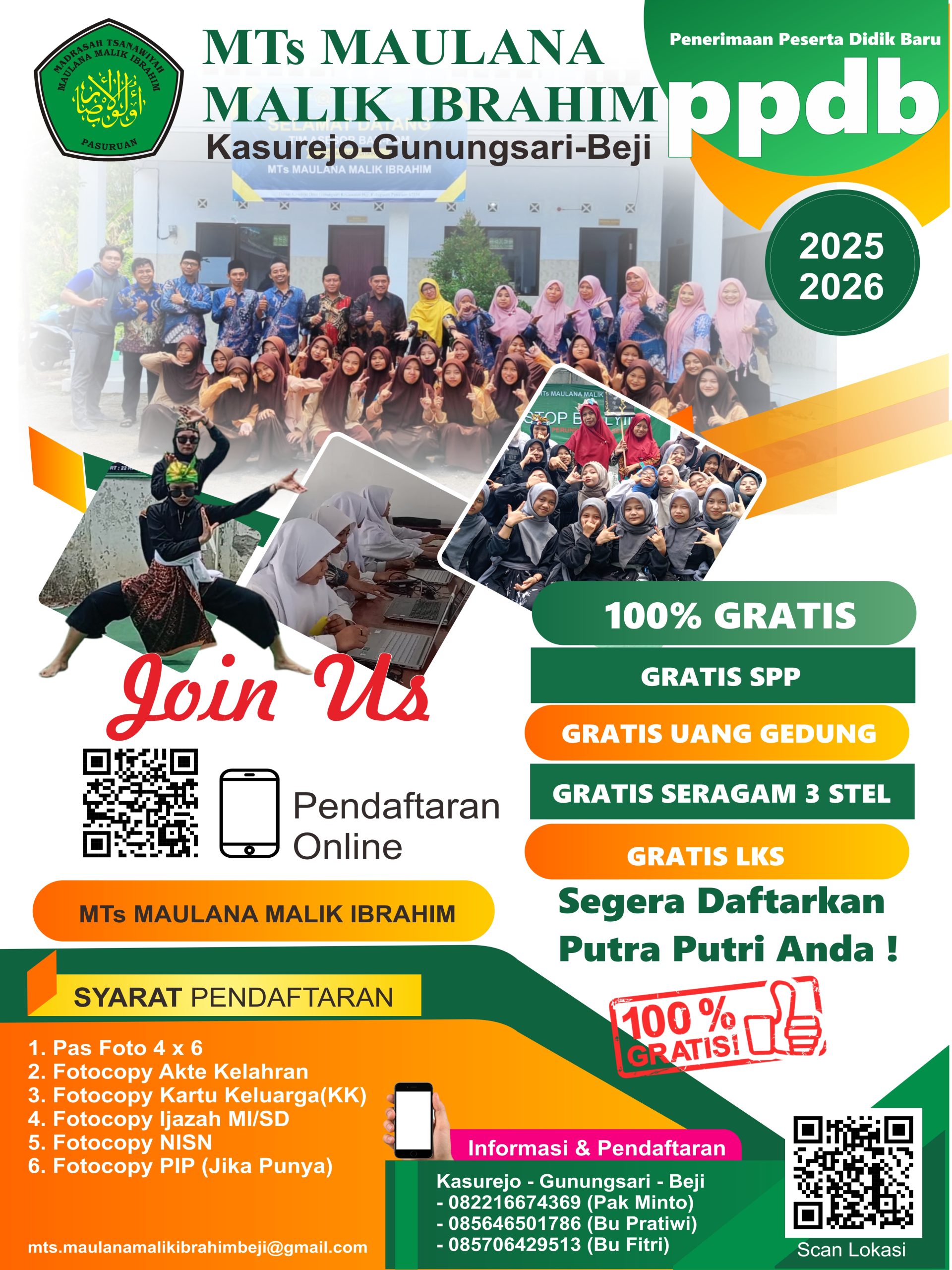 Segera daftarkan putra-putri Anda di MTs Maulana Malik Ibrahim dan nikmati fasilitas pendidikan yang lengkap serta mendukung perkembangan akademik maupun spiritual anak. Jangan lewatkan kesempatan ini!