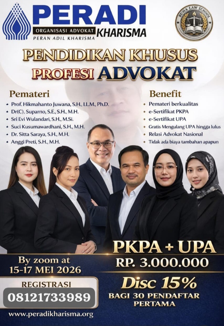 Surabaya meri.co.id – Organisasi advokat PERADI KHARISMA akan menyelenggarakan Pendidikan Khusus Profesi Advokat (PKPA) pada tanggal 15–17 Mei 2026 dan dilanjutkan dengan Ujian Profesi Advokat (UPA).