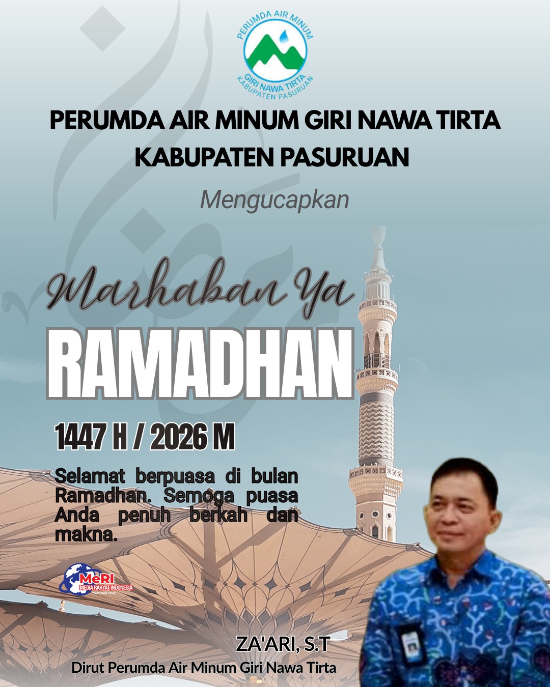 Pasuruan meri.co.id – Dalam rangka menyambut Bulan Suci Ramadhan 1447 H, segenap jajaran manajemen dan karyawan Perumda Air Minum Giri Nawa Tirta menyampaikan ucapan selamat menunaikan ibadah puasa kepada seluruh masyarakat dan pelanggan setia.